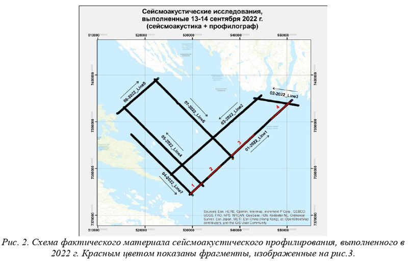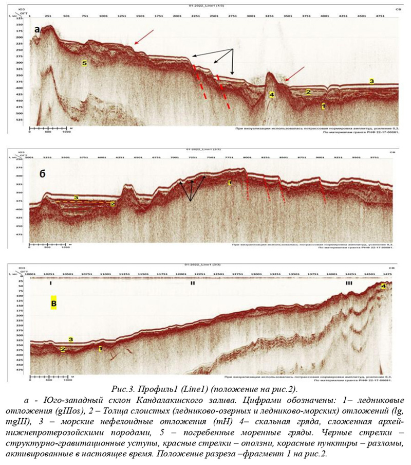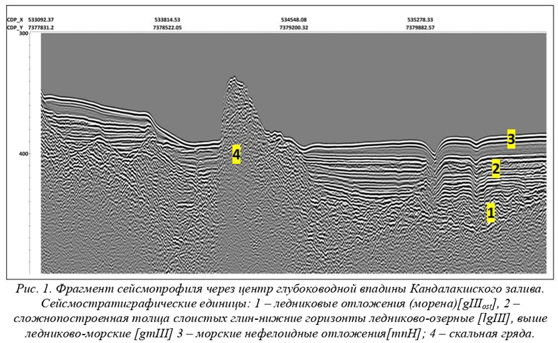 Введение. В рамках проведения работ по гранту РНФ № 22-17-00081 «Последний гляциоседиментационный цикл Белого моря: морфо-, лито- и климатостратиграфия, корреляция морских и континентальных архивов» был выполнен комплекс геолого-геофизических работ, включая многоканальное сейсмоакустическое профилирование на ключевом участке «Кандалакшский залив» В работе также использованы материалы сейсмоакустического профилирования в Кандалакшском заливе, выполненном научно компанией «Сплит» в 2021 г по заявке Института Карпинского (ВСЕГЕИ), В ходе этих работ были получены новые данные, существенно уточняющие существовавшие материалы по сейсмостратиграфии четвертичных отложений Белого моря. Сейсмоакустические исследования всегда играли существенную роль в познании строения четвертичного покрова беломорской впадины. Впервые непрерывное сейсмоакустическое профилирование (НСП) на Белом море было проведено МГУ в 1972 году в рамках опытно-методических геологосъемочных работ (бывшее ВСЕГЕИ). С этого времени этот вид морских геофизических работ занял прочное место в морском геологосъемочном процессе, в частности в литостратиграфическом расчленении толщи четвертичных отложений и в морских геоморфологических исследованиях. Полученные в ходе морских геологосъемочных работ среднего масштаба в Кандалакшском, Онежском заливах и, а также на Онежско-Соловецком и Кольском склонах глубоководной ложбины Белого моря сейсмоакустические материалы позволили создать сейсмостратиграфическую схему четвертичных отложений, включавшую кристаллический фундамент («акустический фундамент»), морену последнего оледенения, надледниковые отложения, включавшие слоистые глины верхнеоплейстоценового возраста и морские нефелоиды, которые были развиты преимущественно в пониженных частях рельефа и занимали около 50% морского дна [Рыбалко и др., 2017, Спиридонов и др., 1980]. Эти материалы сыграли существенную роль в создании в составлении комплекта Госгеолкарт-1000, листы Q-35,36. Новый цикл сейсмоакустических исследований на беломорском шельфе на новых образцах сейсмоакустической аппаратуры, прежде всего с использованием многоканальных систем начался с создания морской геофизической практики на базе ББС МГУ им. М.В. Ломоносова в вершине пролива Великая Салма. В настоящее время этот пролив не только является наиболее изученной сейсмопрофилями площадью в пределах Северо-Западных водных бассейнов восточной периферии Балтийского кристаллического щита, но и мощной методической базой развития новейших методов сейсмоакустического профилирования. В результате была существенно уточнена сейсмостратиграфическая схема для четвертичных отложений Кандалакшского залива (рис.1), установлена большая роль современных гравитационных движений для формирования рыхлого чехла в пределах глубоководной впадины Кандалакшского залива и его окрестностей [Рыбалко и др., 2020], а также выявлены активные неотектонические (сейсмотектонические) проявления, во многом существенно моделирующие донный рельеф и являющиеся современными триггерами для проявления склоновых процессов [Шварев, Никонов, 2018]. Несмотря на высокий уровень изученности в закрытых районах Кандалакшского залива, в открытой его части сейсмоакустическое профилирование практически не проводилось с 70-х годов п