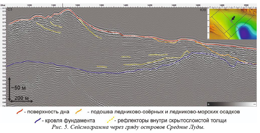 В работе обсуждаются вопросы строения четвертичного покрова Кандалакшского залива в зоне стыка его глубоководной и мелководной частей. Использование новых сейсмоакустических технологий (многоканальное профилирование в модификации ССВР) позволило существенно расширить представления об этой сравнительно мало исследованной зоне. Вместо сплошного скального основания, которое представлялось по предыдущим работам, эта гряда маркированная выходами скальных островов Средние луды и Наумиха, имеет сложное гетерогенное строение, где наряду с архей-нижнепротерозойскими кристаллическим породами большую роль в формировании рельефа играли как моренные отложения, так и отложения мощных конусов выноса интрагляциальных вод. Распределение разновозрастных четвертичных отложений здесь носит мозаичный характер, чему способствуют новейшие геодинамические движения, определяющие мелкоблоковое строение фундамента, которое играет определяющую роль в распространении рыхлых осадков. Существенно уточнено и строение глубоководной котловины Кандалакшского залива. Установлено несплошное распространение моренных отложений и большая роль ледниковой экзарации в формировании поверхности дочетвертичного фундамента. Выявлены структурные гряды на дне котловины. Показано различное строение южного и северного склонов Кандалакшской котловины. Показано цикличное строение толщи слоистых отложений, позволяющее предполагать раннее развитие пресноводных приледниковых бассейнов, которые начали осолоняться за счет проникновения морских вод в аллереде при сохранении цикличного характера осадконакопления. Ключевые слова: Белое море, Кандалакшский залив, четвертичные отложения, ледниковые отложения, морские нефелоиды, современные геодинамические движения, сейсмоакустические методы