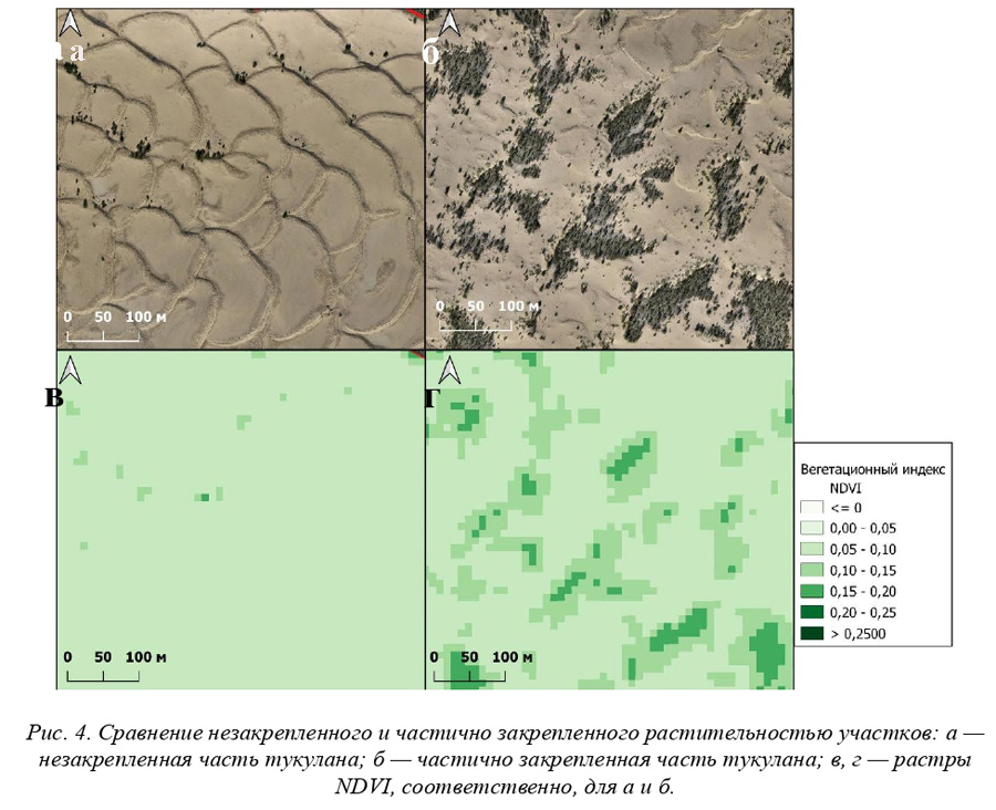 где NIR — значение спектра в канале ближнего инфракрасного излучения (БИК), Red — значение спектра в красном канале. Значения NDVI варьируются от −1,0 до 1,0, где отрицательные значения чаще всего указывают на наличие облаков, водной поверхности или снега, а значения, близкие к нулю — на скалы или оголенную почву. Очень низкие значения NDVI (0,1 и меньше) могут быть связаны с наличием на снимке пустых скалистых участков, песка или снега. Средние значения (от 0,2 до 0,3) говорят об обнаружении кустарников и лугов, а высокие значения (от 0,6 до 0,8) — лесов. Для песчаных массивов использование вегетационных индексов и визуального дешифрирования применялось в различных работах [Zheng et al., 2020; Паламарчук и др., 2023]. Сравнение площади растительности на снимке и ортофотоплане происходило по результатам визуального дешифрирования и расчета индекса NDVI для космического снимка. Результаты. Движение активных дюн имеет два направления — на север и на восток, что соответствует направлению господствующих ветров. Большинство дюн имеет параболическую форму, характерную для участков вблизи береговых линий — в данном случае р. Вилюй. При сравнении дешифрированного ортофотоплана и синтетического растра NDVI четко выделяются участки леса, хуже — отдельно стоящие деревья и кустарники по краям параболических дюн (рис. 4). Значения вегетационного индекса оказались низкими из-за пространственного разрешения снимков (10 м), что не позволяет достоверно отделить единичные деревья или разрозненную растительность по грядам или междюнным понижениям. Поэтому было выбрано значение индекса 0,1 как граничное. На рис. 4а представлен активный участок в северной части тукулана рядом с границей леса (рис. 5). Данный участок представлен активными параболическими дюнами с единичными деревьями и сильно разреженной растительностью. Вегетационный индекс для участка выше порогового значения только для единичных пикселей, куда попали группы деревьев. На рис. 4б, напротив, рисунок дюн читается хуже, «острова» леса и подлеска закрепляют поверхность дюн. На синтетическом растре (рис. 4г) значительны площади со значением NDVI более 0,1. Остановка движения дюн зависит от закрепления поверхности растительностью. Для определения времени остановки движения достаточно данных дистанционного зондирования и расчета индекса NDVI по закрепленной растительности. По результатам сравнения материалов съемки и космических снимков выявлена возможность оценки движения тукулана по данным космических снимков для участков с известной растительностью для оценки дальнейшей динамики. Однако, распознавание разреженных мелких кустарников и травянистой растительности остается трудновыполнимой задачей для космоснимков с пространственным разрешением даже более 0,1 м. Благодарности. Исследование выполнено при поддержке научно-исследовательского проекта № 122011800064-9 «Строение и ключевые этапы эволюции континентальной криолитозоны в неоплейстоцене и голоцене».