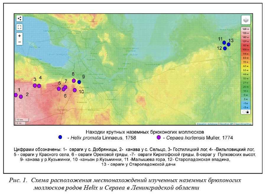 Первые коллекции раковин наземных брюхоногих моллюсков найденные ещё в начале XVIII века российскими учеными на территории хранятся в Кунсткамере г. Санкт-Петербурга. В дальнейшем их изучением занимались биологи ЗИН РАН и СПбГУ. Ряд видов был занесен в Красную книгу Ленинградской области и Санкт-Петербурга. В ходе проведения геологических исследований на территории у северного края Балтийско-Ладожского глинта нами в почвенном слое позднего голоцена помимо раковин широко распространенных видов Cepaea были обнаружены представители более редких видов - Helix promata Linnaeus, 1758 и Cepaea hortensis Muller, 1774 (рис. 1, фото 1-10). Следует отметить, что в большинстве местонахождений данные виды стали заметны лишь в последние 10 лет. Местонахождения преимущественно находятся в низменных частях рельефа. При их расселении вероятно большую роль играет перенос птицами. При немногочисленных популяциях чаще всего обнаруживаются редкие раковины в почвенном слое, а не сами животные, при многочисленных нередки и сами животные. Наши наблюдения показывают, что крупные гастроподы зависят не только от субстрата и типа лесов, но и от рельефа местности: они встречаются в логах, оврагах, впадинах и низменностях преимущественно у северного края глинта. Карбонат кальция служит строительным материалом для раковин. Cepaea hortensis Muller, 1774 (садовая цепея). Краснокнижный вид, требует охраны и наблюдения [Красная книга Ленинградской области, 2008, Красная, книга Санкт-Петербурга, 2004]. Раковина взрослого животного крупная и тонкая: высота раковины 15-20, диаметр 18-35 мм. Раковина правозавитая, удиненно-шаровидная, широкая, низкая имеет 4,5-5,5 оборотов, пупок закрытый. Голова и нога улитки светло-серого цвета с коричневатым оттенком с парой тонких антеннул. Скульптура раковины в виде тонких радиальных морщин. Устье раковины косое красновато-коричневое, его края и губа белого цвета. Окраска раковины: на белом цвете 3 - 5 черных или коричневых поперечных полос (изредка они могут отсутствовать). Ранее редко отмечался в районе Дудергофских высот (Кирхгофская и Ореховая гряды) и в Котельском заказнике [https://cicon.ru/cepeya-sadovaya-lenobl.html]. Нами редкие раковины небольшие популяции этого вида обнаружены на краях 2-х оврагов у края глинта в Красносельском парке (фото 3-5), в каньоне р. Кузьминки, в южной части Гостилицкого и Вильповицкого логов и в овраге у с. Пулково (к востоку от обсерватории). Десятки мелких раковин этого вида встречены нами в канавах у сел Каськово и Добряницы. Helix promata Linnaeus, 1758 (виноградная улитка). Съедобный инвазивный вид (вероятно занесен из Прибалтики). Крупнейшее наземное брюхоногое Европы. Раковина взрослого животного крупная и толстая: высота раковины 30-55, диаметр 23-45 мм. Раковина правозавитая, удиненно-шаровидная, высокая, имеет 4,0-5,5 оборотов, пупок частично закрытый, закруглен. Нога гастроподы широкая светло-серого цвета покрыта светлыми бугорками. Голова c двумя парами антеннул. Поверхность раковины покрыта четкими но тонкими радиальными морщинами роста (иногда загнутыми) наклоненными под острым углом. Последний оборот составляет наибольший объем раковины. Устье раковины косое красновато-коричневое, его края и губа белого цвета. Окраска раковины: зеленовато-серая, светло-, темно-коричневая или красновато-розоватая. Вид повреждает культурные широколиственные растения, может жить в неволе,